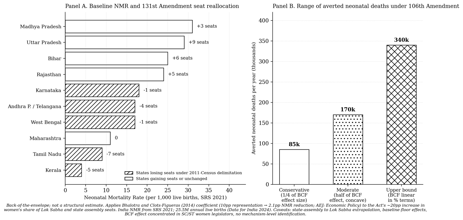 The bill would have shifted seats from states where few babies die in their first month (Kerala 4 per 1,000 live births, Tamil Nadu 9) to states where many still do (Uttar Pradesh 29, Madhya Pradesh 31). At first, that looks like it should help, because those are the states with the most room to improve. The published evidence says otherwise: the health gains from women legislators come almost entirely from women elected on SC and ST reserved seats. Without an OBC sub-quota, the reservation allocates the new seats to women whose social composition does not match that identified by the evidence. Panel B translates the twenty-point increase in representation into averted child deaths per year under three assumptions about the mechanism's strength. The conservative scenario gives around 85,000 averted deaths per year. The moderate gives 170,000. The upper bound gives 340,000. All three are large. The range reflects the degree to which the mechanism is assumed to hold under a reservation regime.