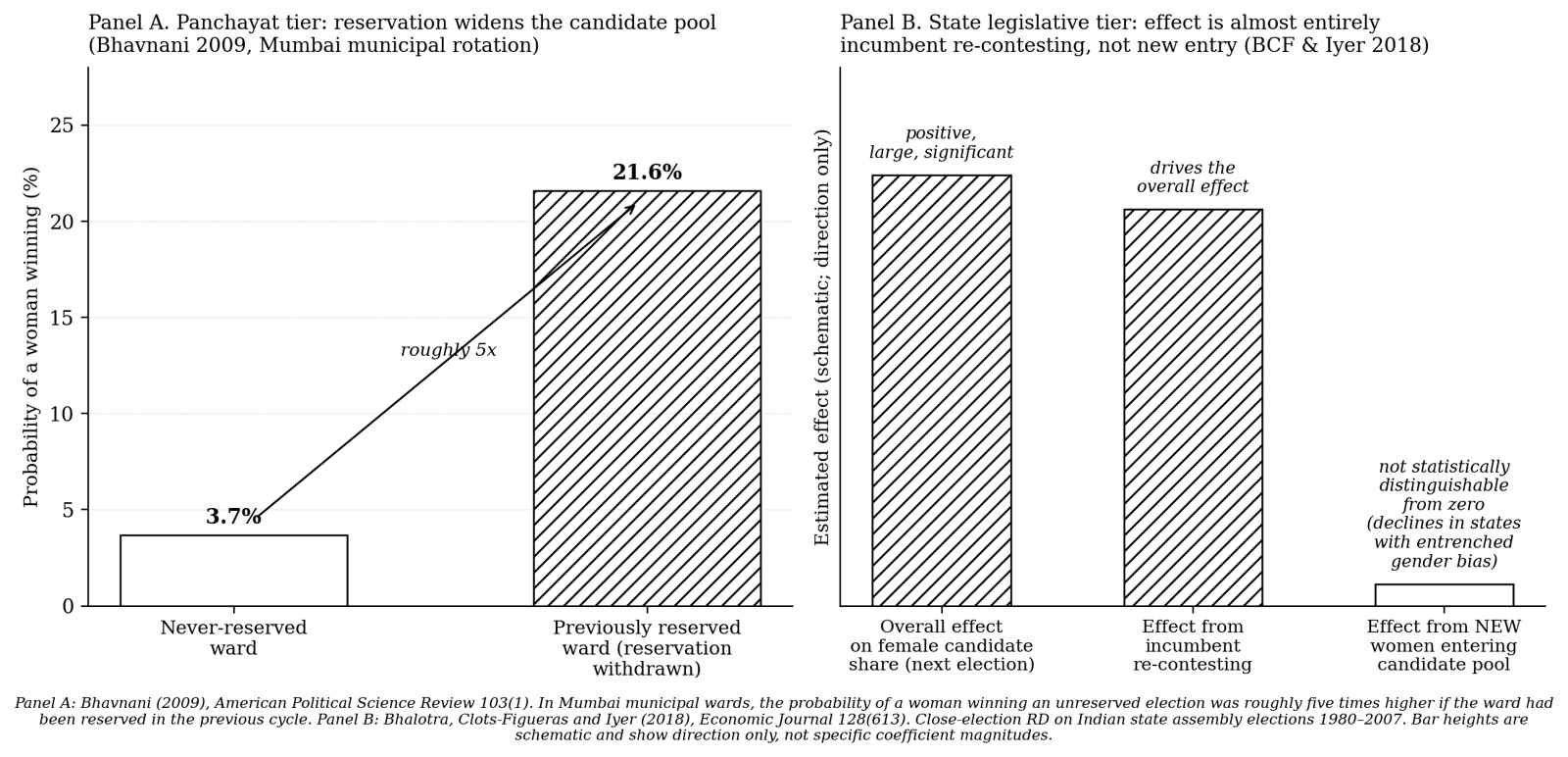 Panel A: Bhavnani 2009, APSR 103(1), on Mumbai municipal ward rotation. Panel B: Bhalotra, Clots-Figueras and Iyer 2018, Economic Journal 128(613), on close-election regression discontinuity in Indian state assemblies 1980-2007. Panel B heights are schematic; they show the direction and decomposition of the estimated effect, not the specific magnitudes of the coefficients.