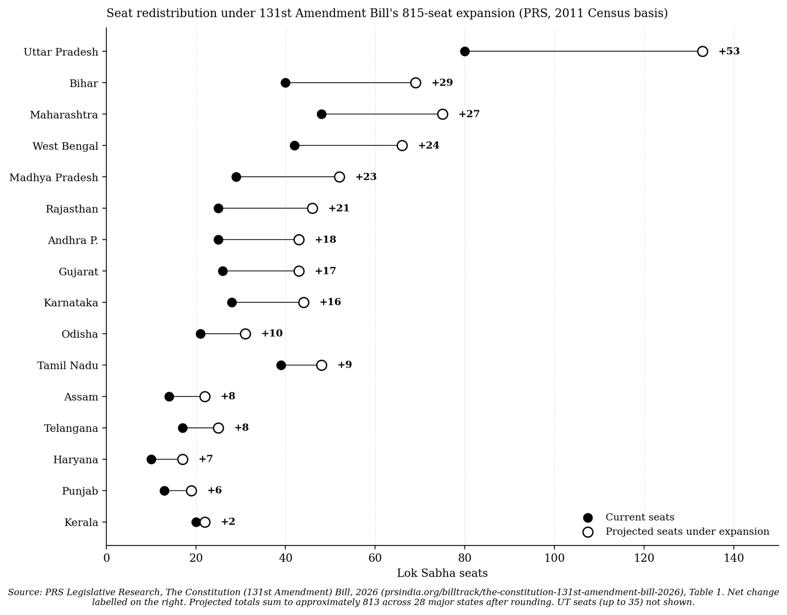 The PRS analysis of a 2011 Census-based delimitation, with the current total of 543 seats, shows Tamil Nadu losing 7 seats, from 39 to 32. Kerala loses five, from 20 to 15. The combined Andhra Pradesh-Telangana unit loses four. Karnataka loses one. Uttar Pradesh gains nine, from 80 to 89. Bihar gains six. Rajasthan gains five. Madhya Pradesh gains three. Under the proposed expansion to roughly 815 seats, the absolute gap widens: Uttar Pradesh rises to 133 seats, Bihar to 69, Tamil Nadu to 48, and Kerala to 22. Karnataka Chief Minister Siddaramaiah's own calculations, circulated in the days before the vote, estimated that five southern states would gain roughly 64 seats under the expansion formula, while seven BJP-dominated northern and western states would gain roughly 130 seats.